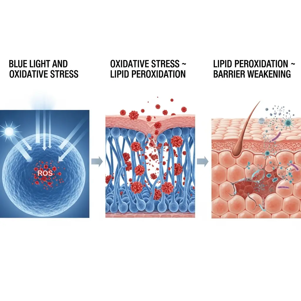 Mavi ışığa uzun süreli maruz kalma, epidermiste reaktif oksijen türlerinin (ROS) birikimine neden olur. ROS üretimi arttığında hücre içi antioksidan savunma sistemi — başta glutatyon, katalaz, süperoksit dismutaz — azalır. Bu durum keratinositlerde lipit, protein ve DNA hasarını tetikler (Pérez-González et al., 2021).