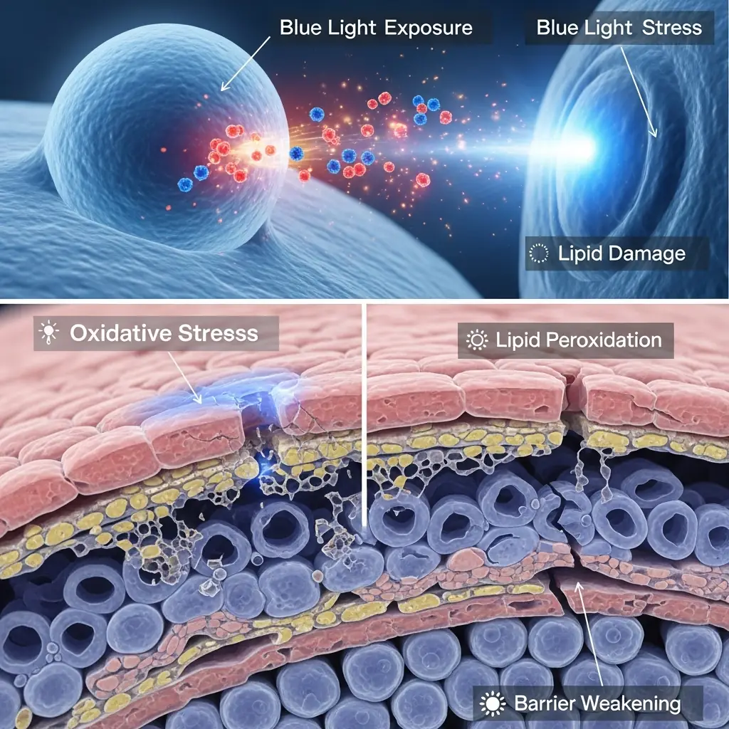 Long-term exposure to blue light leads to an accumulation of reactive oxygen species (ROS) within epidermal cells. When ROS production increases, the intracellular antioxidant defense system—primarily glutathione, catalase, and superoxide dismutase—becomes depleted. This imbalance triggers lipid, protein, and DNA damage in keratinocytes (Pérez-González et al., 2021).